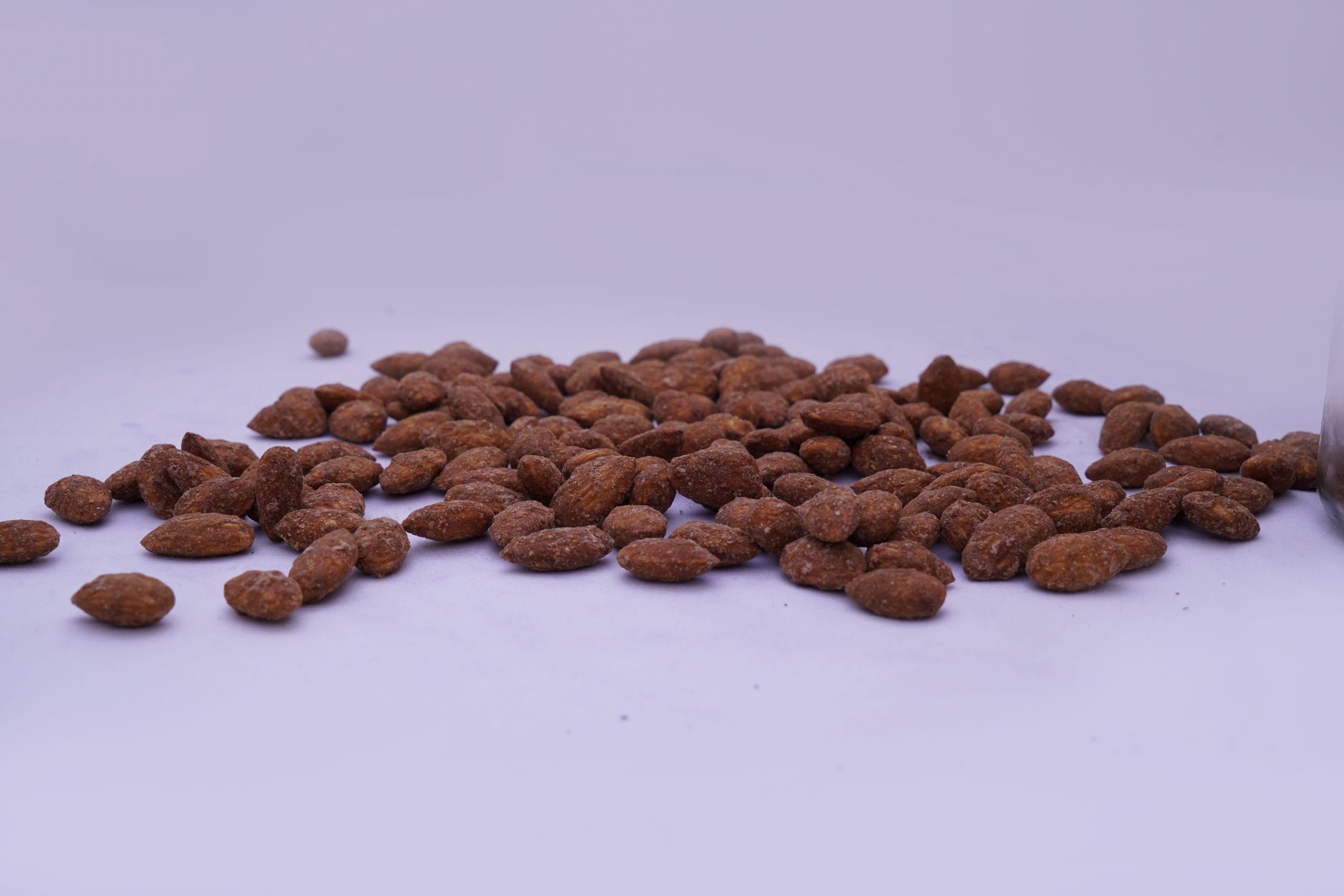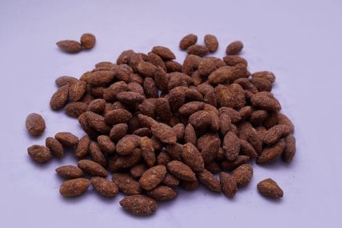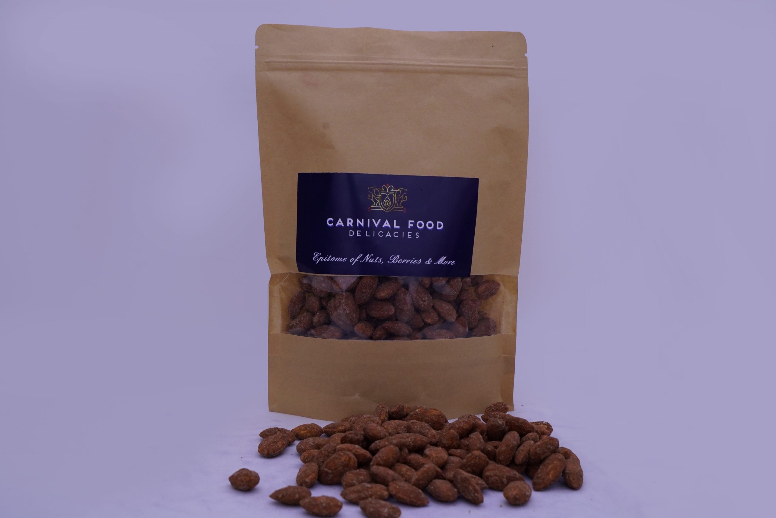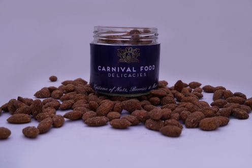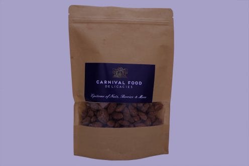 Almonds coated with the goodness of honey with a sprinkle of cinnamon. A perfect combination of nuts and exactic flavours.While the almond is often eaten on its own, raw or toasted, it is also a component of various dishes. Almonds are available in many forms, such as whole, slivered, and ground into flour. Almond pieces around 2–3 mm in size, called “nibs”, are used for special purposes such as decoration. Almonds are 4% water, 22% carbohydrates, 21% protein, and 50% fat (table). In a 100-gram (31⁄2-ounce) reference amount, almonds supply 2,420 kilojoules (579 kilocalories) of food energy.