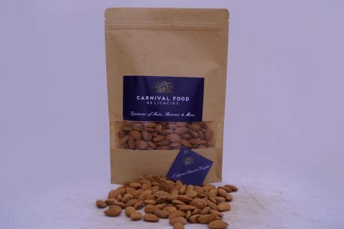 Simple yet exotic, California Almonds always make a perfect. While the almond is often eaten on its own, raw or toasted, it is also a component of various dishes. Almonds are available in many forms, such as whole, slivered, and ground into flour. Almond pieces around 2–3 mm in size, called “nibs”, are used for special purposes such as decoration. Almonds are 4% water, 22% carbohydrates, 21% protein, and 50% fat (table). In a 100-gram (31⁄2-ounce) reference amount, almonds supply 2,420 kilojoules (579 kilocalories) of food energy.